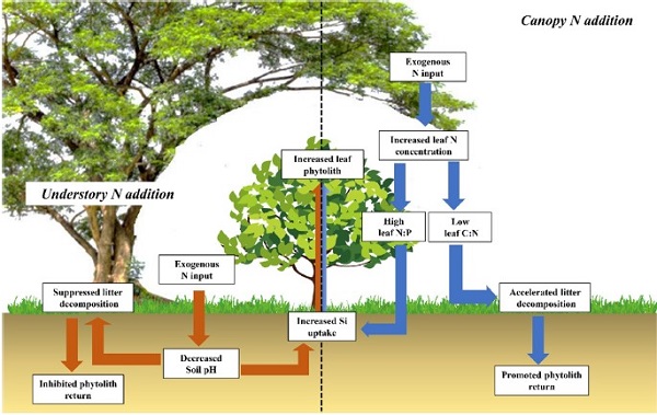 氮富集促发的土壤生物地球化学性质改变深刻影响着陆地生态系统碳循环及其相关过程。森林生态系统中植物-土壤系统中植硅体(phytolith)循环与森林生态系统植硅体碳(PhytOC)的变化紧密相关。
