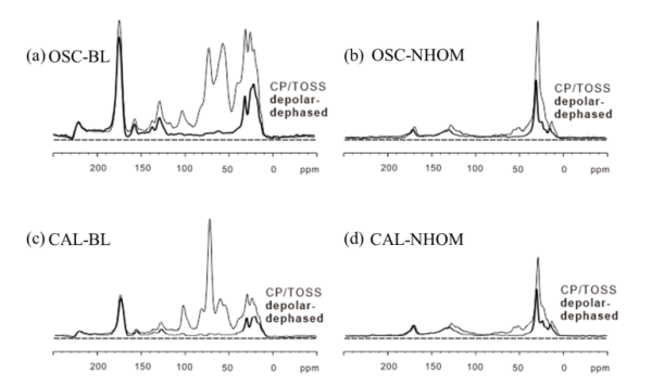 图1.颤藻和畸形眉藻原始样品(BL)及其NHOM组分的13C NMR谱图。 细线:非选择性CP/TOSS光谱;粗线:对应的偶极去相CP/TOSS光谱。