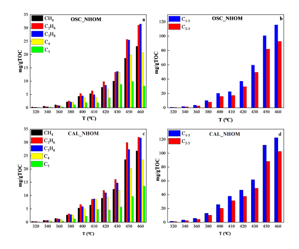图2. 不同裂解温度下,OSC_NHOM和CAL_NHOM产生的气态烃含量变化图。C4为异丁烷和正丁烷的总含量; C5是异戊烷和正戊烷的总含量。