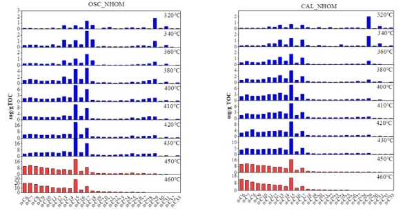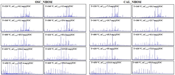 图4. 在不同裂解温度下,OSC_NHOM和CAL_NHOM样品产生的正构烷烃(n-C6-33)含量。