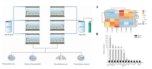 该论文以鳞砗磲幼贝为研究对象,通过结合宿主、虫黄藻生理指标测定、钙化测定、高通量测序手段,探索了砗磲幼贝在组织生理和分子层面对海洋酸化的响应和反应机制。结果显示,海洋酸化不会导致砗磲幼贝存活率和贝壳生长性能的显着降低,说明砗磲幼贝可以耐受适度酸化环境;然而,宿主钙化率的显著性降低表明砗磲对海洋酸化的具有钙化生理敏感性,同时共生虫黄藻的光合速率降低和虫黄藻密度下降,反过来又降低了显著耗能的钙化过程的能量供应量;比较转录组差异表达基因的比较分析表明,砗磲幼贝可以通过调节代谢抑制、钙稳态、生物矿化以及离子通道等相关基因的表达以应对海洋酸化的影响。上述研究成果对砗磲的人工繁育、种群恢复以及资源保护具有重要的科学价值。