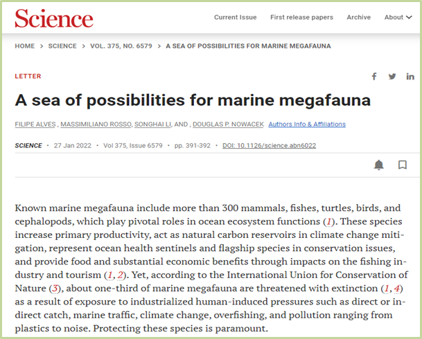 2022年1月27日,来自中国科学院深海科学与工程研究所、美国杜克大学海洋实验室、葡萄牙海洋与环境科学中心(MARE)以及意大利国际环境监测中心(CIMA)等多家国内外科研机构的科学家,联名在期刊Science发表了题为“A sea of possibilities for marine megafauna”的Letter文章,旨在共同呼吁加强对海洋大型动物的研究和保护工作。