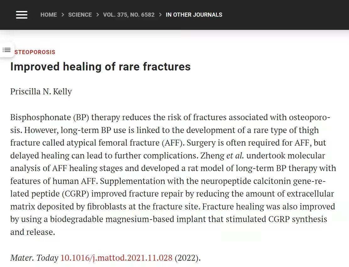 近日,香港中文大学/中国科学院深圳先进技术研究院医工所转化医学研究与开发中心秦岭教授团队和圣路易斯华盛顿大学的RegisO’Keefe团队联合在Material Today (IF = 31) 杂志上发表了题为“Magnesium Facilitates the Healing of Atypical Femoral Fractures: A Single-cell Transcriptomic Study”的原创研究论文。2月17日被Science杂志以“Improved healing of rare fractures”为题进行Research Highlights报道。论文第一作者是郑念野、许建坤,深圳先进院转化医学研究与发展中心主任秦岭为该文通讯作者。