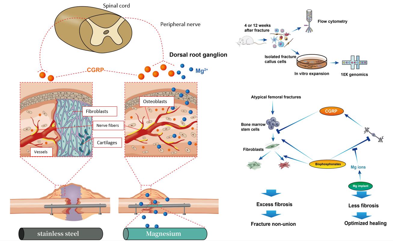 该研究使用了包括单细胞测序在内的多种研究手段,详细阐述了双膦酸盐(BPs)在治疗非典型股骨骨折(AFF)过程中的细胞和分子机制。利用OVX手术建立大鼠骨折模型后,使用BPs进行治疗,研究团队发现在BPs促进骨折愈合的过程中,降钙素基因相关性肽(CGRP)表达下降,并伴随干细胞/骨前体细胞异常分化的不良影响。作者进一步实验发现,局部补充CGRP可有效促进骨折愈合。为此,该团队发明了一种新型载镁髓内针(Mg-IMN),其效果与局部注射CGRP的作用类似。