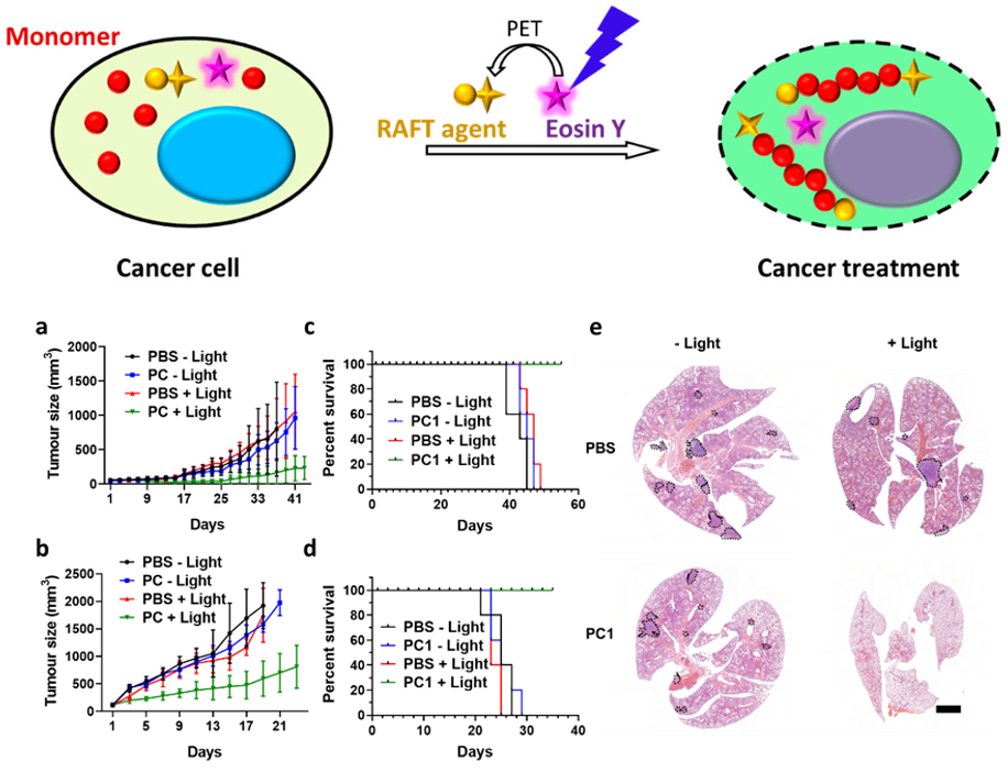 研究团队利用光控PET-RAFT聚合替代自由基聚合的方法,实现了分子量可预测、可调控的聚合物合成方法学开发,同时使所获得聚合物的分子量分布大幅降低,有效提高了聚合物的规整度,并且有效提高了细胞内聚合体系在时间、空间上的可控性和可重复性,大幅减少单体及引发剂的用量,降低聚合反应物体系本身对细胞产生的毒性。同时我们对细胞内聚合体系的应用潜力进行了进一步探索,以肿瘤治疗为目的对聚合单体库进行了更大范围的筛选,并成功发展了一种基于细胞内聚合的精准肿瘤治疗体系。通过对细胞毒性的筛查研究,我们发现了一类本身具有较低毒性的丙烯酰胺聚合单体能够在聚合后显著提高其细胞毒性,高效引起肿瘤细胞的凋亡和坏死,和高效抑制肿瘤转移,并利用这一性质开发了一种全新精准肿瘤治疗方法。
