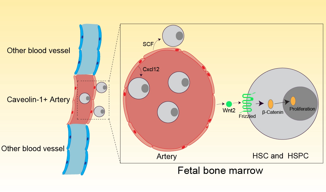 在成年哺乳动物体内,造血干细胞主要存在于骨髓中。造血干细胞的维持、静息和增殖等行为受到其微环境的调控。成年动物骨髓中造血干细胞和骨髓微环境的相互作用,已被较深入研究。但胚胎期骨髓微环境如何调控造血干细胞的行为仍不清楚。