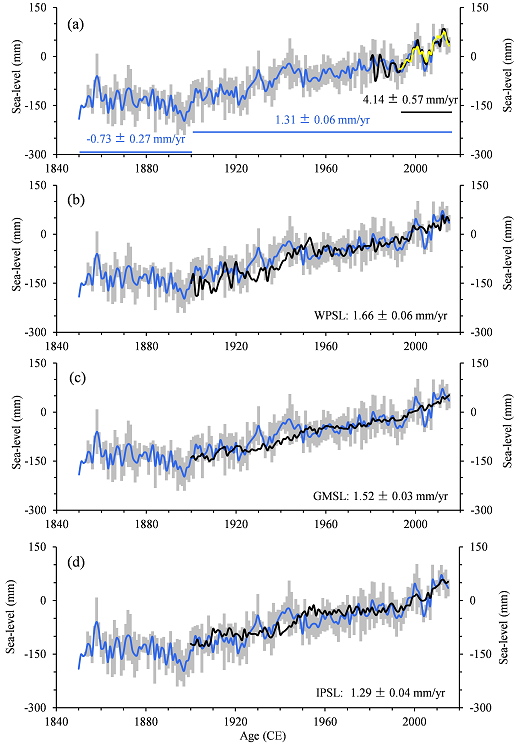 研究人员综合分析了南海滨珊瑚δ18O与器测的海平面、海温、盐度、降雨之间的关系,确定了南海海平面与珊瑚δ18O的统计关系,以及控制机理。利用珊瑚δ18O定量重建了公元1850年以来的南海海平面变化历史。研究结果显示,在1850–1900年时段,海平面的平均下降速率为0.73毫米/年;随着全球升温,在1900–2015年时段的上升速率为1.31毫米/年,1993年以来的上升速率为3.75毫米/年,南海海平面呈现加速上升趋势。研究认为,~1850–1950年的南海海平面变化可能是太阳活动和温室气体共同作用的结果,而1950年代以来,温室气体可能主导着海平面的快速上升。