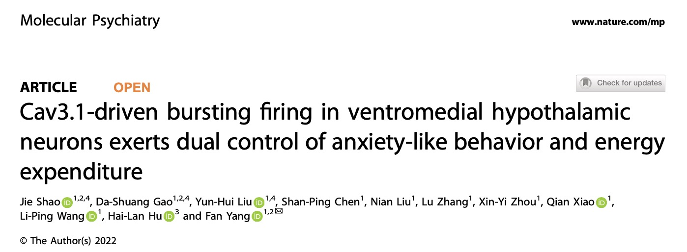 北京时间2022年3月22日,中国科学院深圳先进技术研究院脑认知与脑疾病研究所、深港脑科学创新研究院杨帆课题组在Nature旗下的神经科学领域著名期刊Molecular Psychiatry (IF 15.9)上发表题为“Cav3.1-driven bursting firing in ventromedial hypothalamic neurons exerts dual control of anxiety-like behavior and energy expenditure”的最新研究成果。揭示了慢性压力应激中下丘脑腹内侧核团(Ventromedial hypothalamus, VMH)神经元的簇状放电对焦虑及能量代谢的调控作用,而钙离子通道Cav3.1在上述调控中扮演了重要角色。