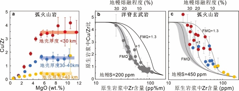 图1. a)弧火山岩中Cu/Zr比与MgO协变图,b,c)定量模拟地幔熔融过程中原生洋中脊玄武岩和原生弧岩浆Cu/Zr的系统变化,指示弧下地幔比洋中脊下方地幔更氧化。