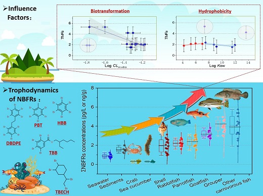 该研究工作通过探讨NBFRs的行为和特性,分析了NBFRs在南海热带食物网中的营养传递动力学,揭示了疏水性和代谢转化特性对NBFRs富集和放大效应的决定作用,为预测该类型新污染物的水生态风险提供重要的理论依据。