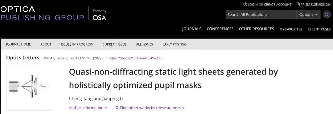 3月26日,中国科学院深圳先进技术研究院光电工程技术中心李剑平正高级工程师团队在知名光学期刊Optics Letters上发表了题为“Quasi-non-diffracting static light sheets generated by holistically optimized pupil masks”的文章,报道了一种生成薄而宽的准无衍射激光光片的光瞳掩模优化设计方法。博士后研究员唐城博士为论文第一作者,李剑平博士为通讯作者。