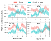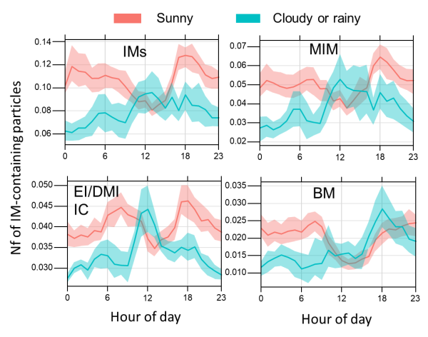 图2. 含咪唑类化合物(IMs)、甲基咪唑(MIM)、乙基咪唑/二甲基咪唑/咪唑-2-甲醛(EI/DMI/IC)和联咪唑(BM)颗粒在晴天和阴雨天的昼夜变化