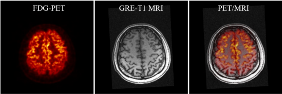 SIAT bPET和联影uMR790 3T磁共振成像系统上同时获得的人脑PET/MRI图像