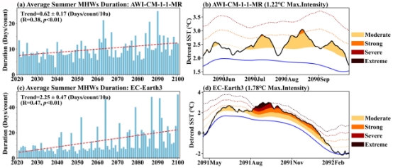 海洋热浪是指发生在海洋中的极端高温事件,给海洋生态系统带来严重威胁,例如珊瑚礁白化、海草床和海藻林面积减少等,从而影响整个生态系统的结构和功能。受异常西北太平洋副热带高压的影响,我国南海尤其是南沙群岛和北部湾海域经常发生长时间、高强度的海洋热浪事件,是引发南海珊瑚礁白化的重要原因。基于不同模式以及不同情景下的西北太平洋副热带高压研究表明,未来强西北太平洋副热带高压事件有明显的增加趋势。那么,未来南海海洋热浪对强西北太平洋副热带高压事件增加是如何响应的呢?