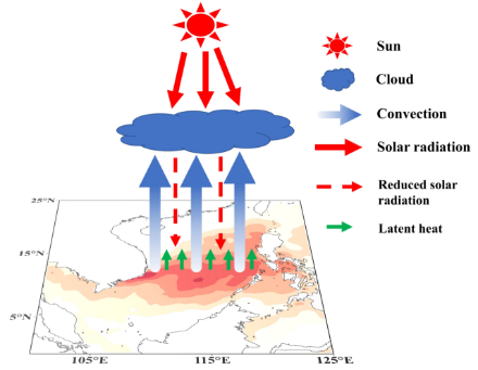 当未来西北太平洋副热带高压增强时,由于反气旋环流所造成的异常东风将减弱南海夏季西南季风,使得南海表面风应力与风应力旋度减小,抑制南海中南部的上升流。缺少了上升流所带来的冷却效应,南海海表温度将快速升温,从而导致南海夏季海洋热浪事件的增加。而当南海出现持续性海洋热浪事件时,高温海水会增强表面蒸发,增加潜热损失;同时加强对流,从而导致大量对流云的形成,进而降低太阳辐射(图2)。这种海温-云负反馈机制将南海夏季海洋热浪的平均强度限制在一个较低的范围,因此未来南海夏季海洋热浪的平均强度对西北太平洋副热带高压增强的响应较弱。
