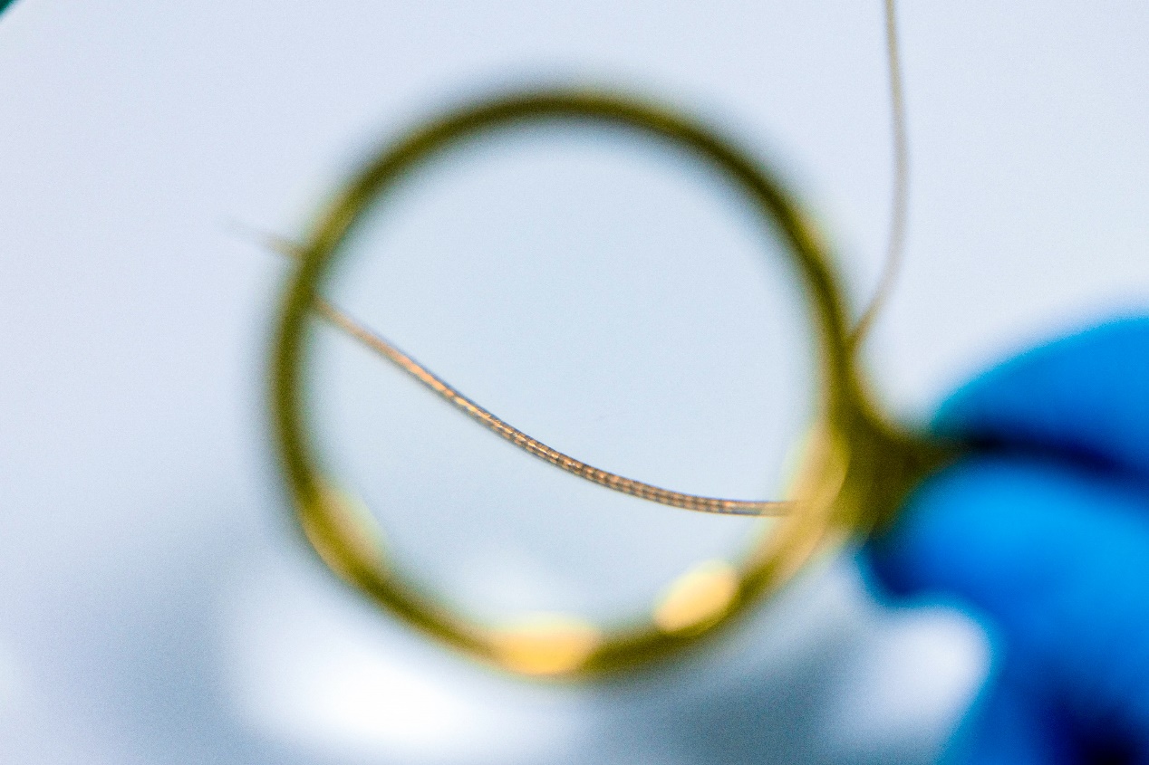 在该研究中,研究团队首先要解决的难题,便是如何在一根直径约为200微米的纤维上,布局数十个独立的电极通道,这相当于在一根头发丝上拆分雕刻出数十根长度一致、彼此不能交叉的细线,还要保证这根纤维足够柔软且可拉伸。