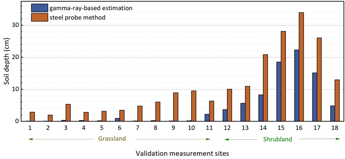 图2. 伽马射线土壤厚度估算法与钢钎法的对比