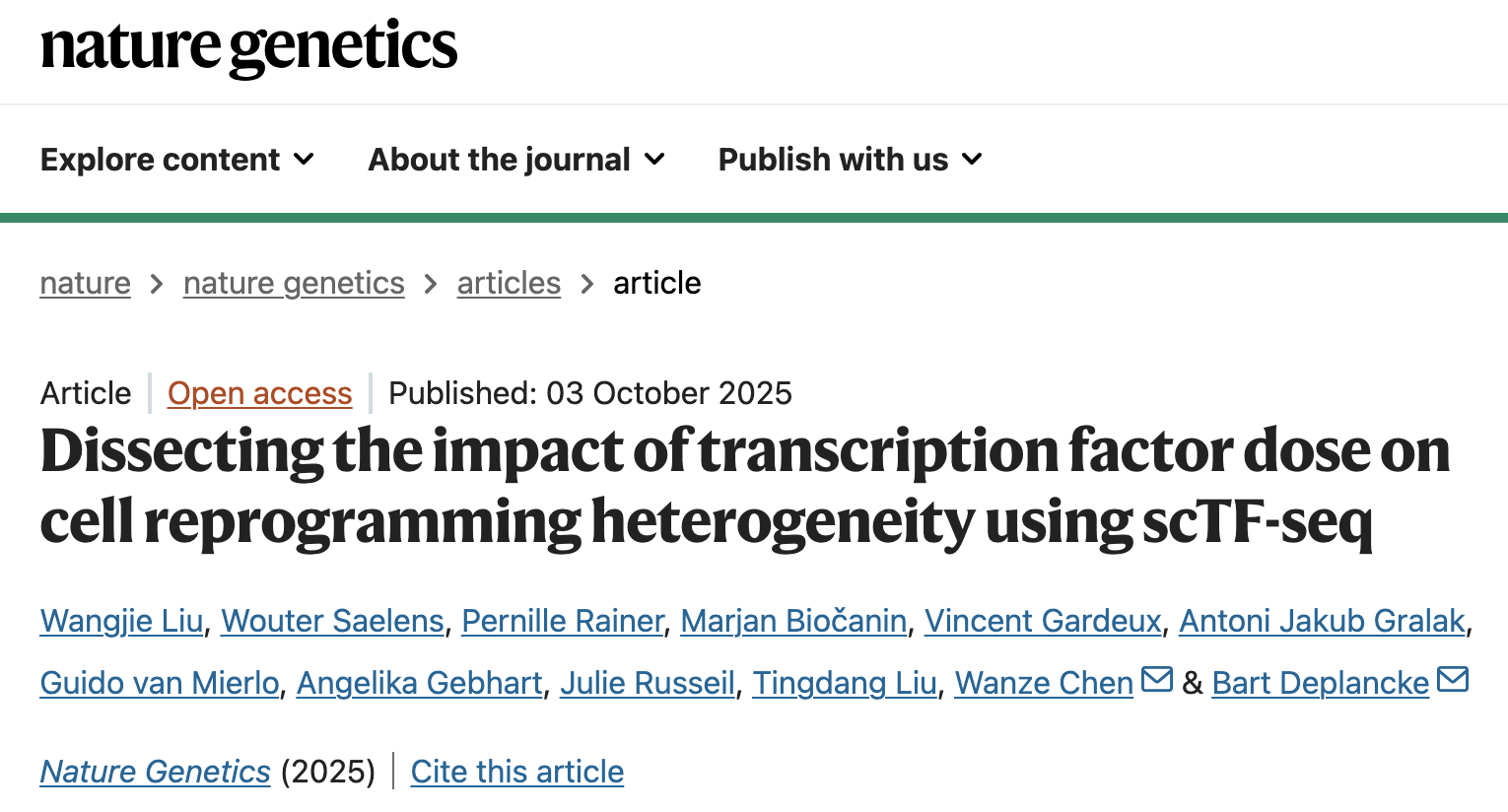 2025年10月3日,中国科学院深圳先进技术研究院合成生物学研究所陈万泽课题组与瑞士洛桑联邦理工学院(EPFL)Bart Deplancke课题组合作,在Nature Genetics发表了题为"Dissecting the impact of transcription factor dose on cell reprogramming heterogeneity using scTF-seq"的研究成果。团队开发了scTF-seq技术,实现了剂量敏感的大规模基因扰动单细胞组学,并以转录因子介导的细胞重编程为模型,系统揭示了基因剂量在细胞命运调控中未被充分认识的多层次、非线性复杂效应。