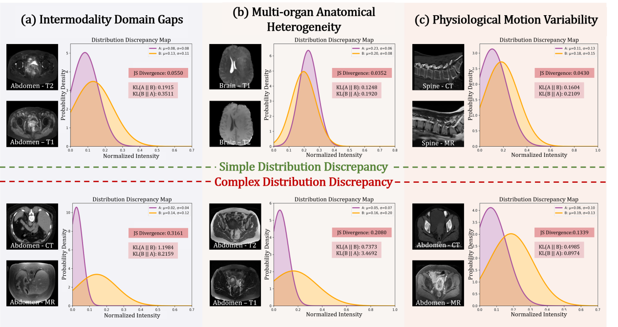医学图像配准在放射治疗计划、手术导航及多模态影像融合中发挥着关键作用。然而,无监督多模态配准方法常常受到灰度分布差异、解剖结构异质性和生理运动变异 的影响,导致配准精度不足。