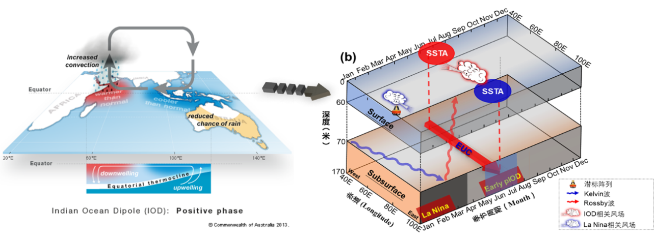 图1:(a) 赤道潜流是热带海洋环流系统中一支“水下高速通道”,影响热带物质能量输运;(b) 赤道印度洋潜流夏季重现背后的“双重调控魔术”示意图