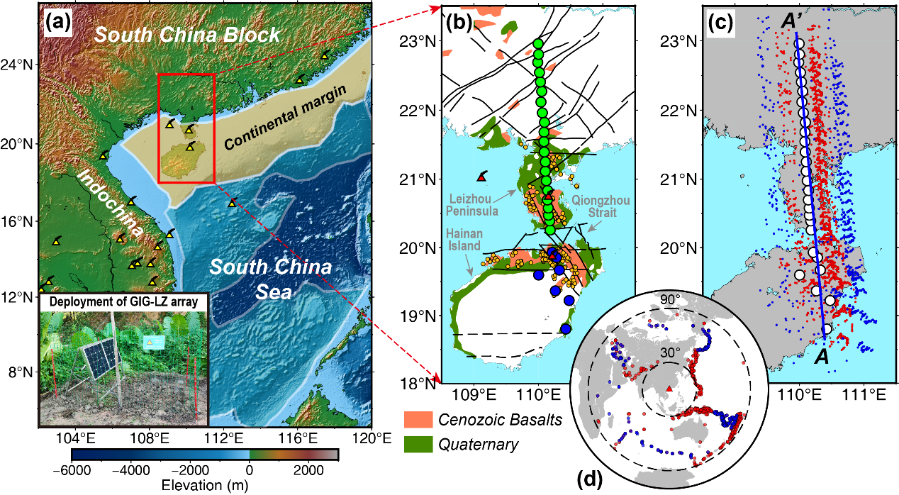 图1. (a) 雷琼火山区(LQV)及周边地形图。(b) 本研究使用的地震台站分布。绿色圆圈和蓝色圆圈分别标注GIG-LZ台阵和固定台站位置。(c) 远震事件射线追踪得到的Ps(红点)和Sp(蓝点)穿透点,蓝色线条为偏移成像剖面的位置。(d) 本研究采用的远震事件分布。红色三角形为研究区中心,红点和蓝点分别代表P波和S波事件。