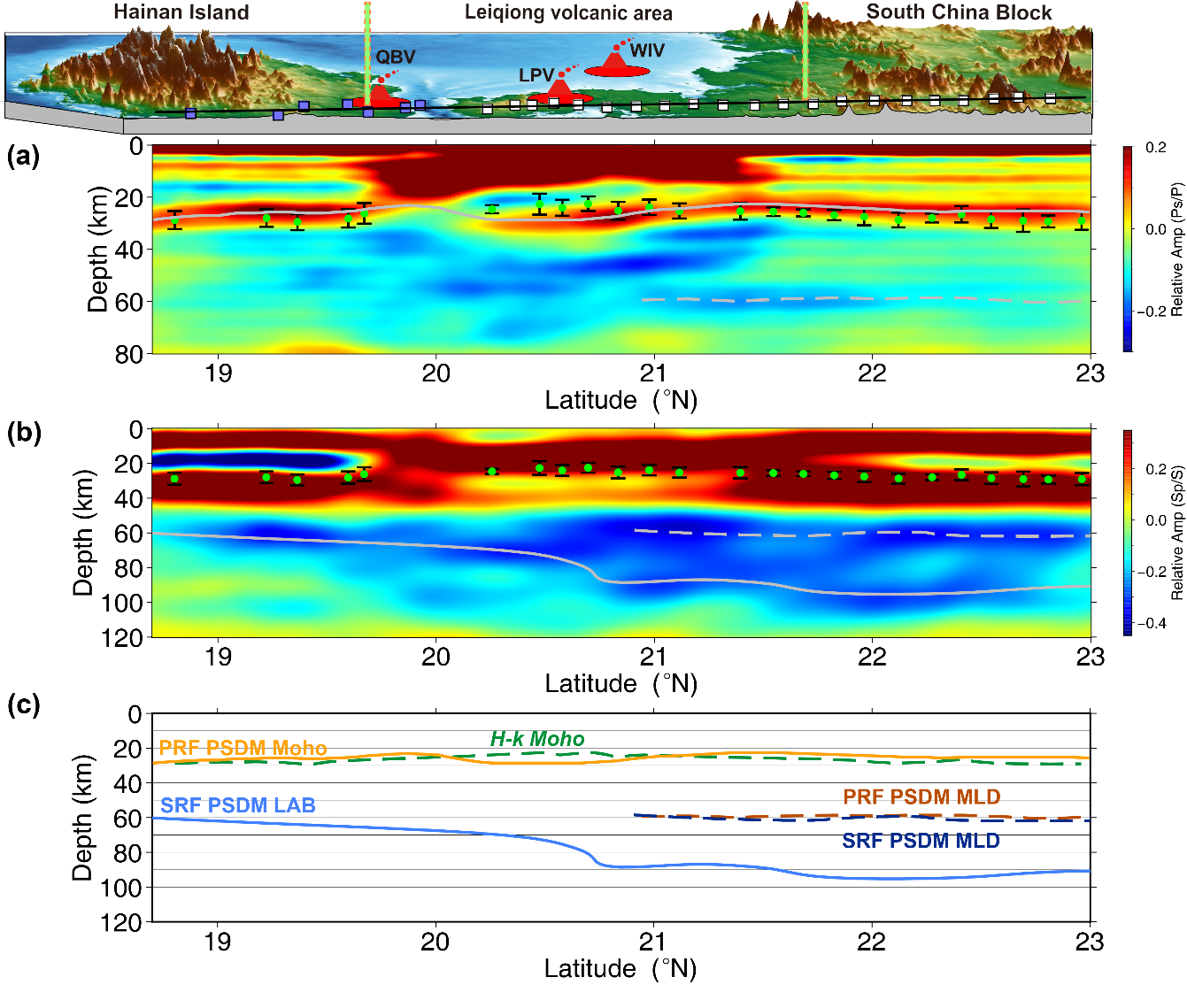 图2. (a,b)沿A-A'剖面的P波接收函数(PRFs)和S波接收函数(SRFs)的叠后深度偏移成像(PSDM)图像。绿点表示P波接收函数波形叠加方法估算的地壳厚度。(c)A-A'剖面莫霍面、MLD和LAB界面的示意图。顶部俯视图显示地震台站分布:白色立方体为GIG-LZ阵列台站,蓝色立方体为固定台站。QBV: 琼北火山;LPV: 雷州半岛火山;WIV: 涠洲岛火山。