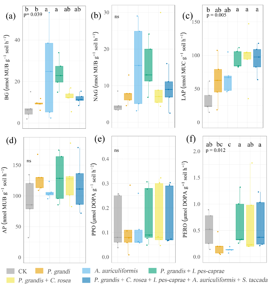 图1. 热带珊瑚岛不同植物种植模式下土壤酶活性