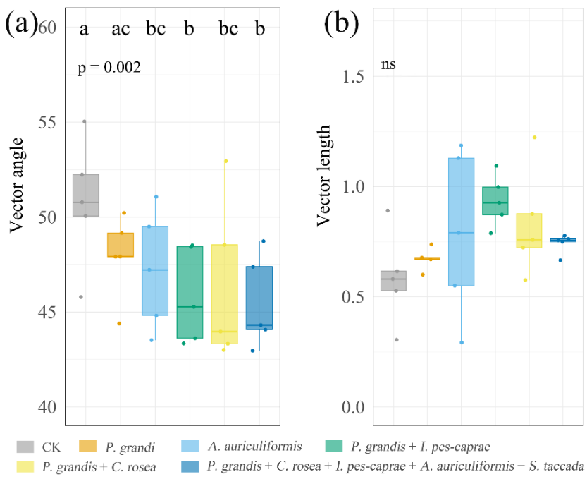 图2. 热带珊瑚岛不同植物种植模式下酶矢量特征