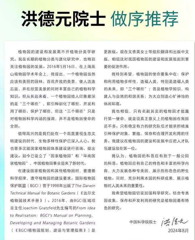 《BGCI植物园规划、建设与管理指南》的出版,旨在提供植物园相关指导和最新信息。同时,作为我国首部植物园规划设计、运营管理专业书,该书出版填补了植物园规划发展运营管理工具书的空白,为指导我国植物园的建设与管理、促进我国植物园与国际接轨提供重要参考。
