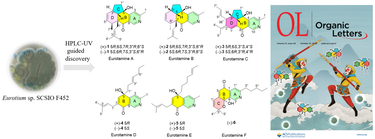 近日,中国科学院南海海洋研究所热带海洋环境与岛礁生态全国重点实验室、热带海洋生物资源与生态实验室张偲院士团队在南海沉积环境来源真菌中活性新骨架异喹啉型生物碱对映异构体的发现领域取得新进展,相关成果以“HPLC–UV-Guided Discovery of Eurotamines A–F: Six Pairs of Isoquinoline Derivative Enantiomers from Marine-Derived Fungus Eurotium sp. SCSIO F452”为题,表于国际有机化学领域自然指数期刊Organic Letters,并入选Supplementary Cover。项目研究员仲伟茂为论文第一作者,研究员王发左、院士张偲为共同通讯作者。