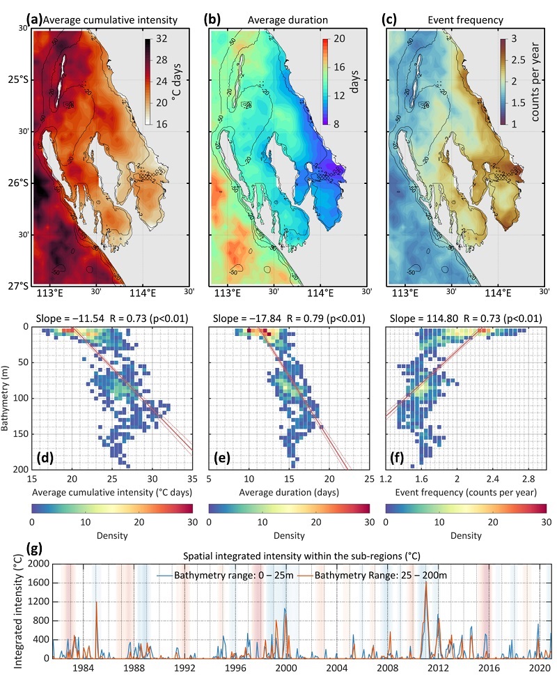 图 1 鲨鱼湾海洋热浪指标的时空特征。(a‒c)1981–2020 年海洋热浪事件平均累积强度、持续时间和发生频率的空间分布;(d‒f)三者与水深关系的散点密度分布及线性拟合(红色实线,虚线为 95% 置信区间);(g) 湾内(≤ 25 m)与湾外(> 25 m)区域的月平均强度,背景阴影为 NOAA 提供的海洋尼诺指数 (ONI)