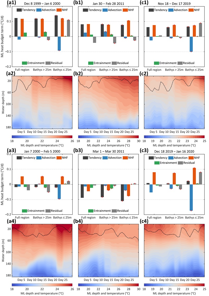 图2 鲨鱼湾混合层热收支。(a1‒c2) 2000、2011 和 2019 年海洋热浪事件的形成阶段,(a3‒c4)消亡阶段。(a1)2000 年事件形成阶段全区、湾外区域(> 25 m,菱形标记)和湾口区域(≤ 25 m,方形标记)的体积加权温度变化率及水平平流、净热通量、夹卷过程及残差项的贡献;(a2) 同事件的面积加权海洋温度剖面,并叠加混合层深度(MLD,黑色虚线);(a3‒a4)与(a1‒ a2)类似,但为消亡阶段;(b1‒b4)与 (a1‒a4)类似,但对应 2011 年事件的形成阶段与消亡阶段;(c1‒c4)与(a1‒a4)类似,但对应 2019 年事件的形成阶段与消亡阶段