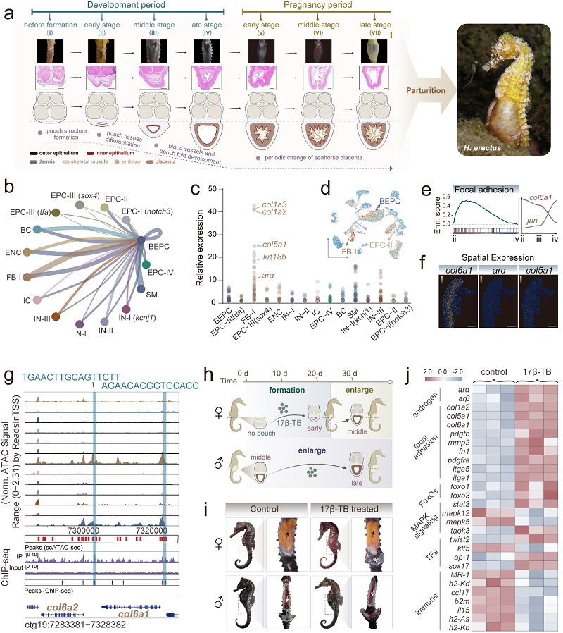 为了深入探究海龙科物种育儿袋发生及其怀孕过程的遗传与细胞学调控机制,研究团队以海马和海龙为研究材料,通过整合单细胞RNA测序(scRNA-seq)、单细胞染色质可及性测序(scATAC-seq)及空间转录组等多组学手段,绘制了海马育儿袋7个发育时期的细胞学动态变化图谱,发现了一类具有干细胞潜能的“育儿袋上皮祖细胞(BEPCs)”。这些细胞在发育过程中与胶原蛋白基因协同表达,并受雄激素信号强烈调控。同步,该研究通过动态网络生物标志物分析及在体实验,证实雄激素处理的雌性海马可发育出雄性特有的育儿袋。据此,本研究首次提出了雄激素受体及其调控的育儿袋上皮祖细胞是激活育儿袋器官形成的关键开关(图2)。