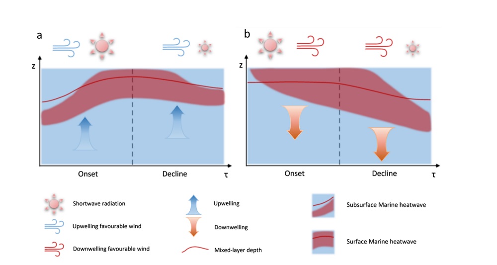 海洋热浪可理解为“水中的热浪”,当海水温度在一段时间内显著高于气候平均值时便形成此类事件。长期以来,学界普遍认为沿岸上升流系统(Coastal Upwelling System)可能是抵御热浪的“冷庇护所”(thermal refugia)。上升流由季风或沿岸风驱动,将深层冷水输送到表层,从而抵消部分变暖效应。然而,上升流与海洋热浪究竟如何相互作用?它能否真正“限制”海洋热浪的发展深度?这些问题一直缺乏系统的定量研究。