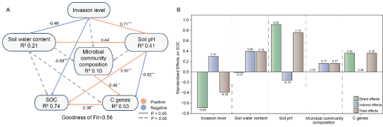 (二)毛竹入侵显著降低了土壤细菌群落多样性与网络复杂性,抑制了与碳循环相关的关键功能基因,导致土壤有机碳含量显著降低。通过Meta分析进一步验证了毛竹入侵普遍导致土壤有机碳含量降低的趋势。表明毛竹入侵通过改变土壤理化性质削弱微生物碳循环潜力,从而影响森林碳汇功能。该研究成果以“Soil Organic Carbon Decline under Bamboo Invasion: The Role of Microbial Carbon Cycling”为题发表于国际学术期刊 Journal of Environmental Management(IF5-year :8.6)上,中国科学院华南植物园鼎湖山站硕士研究生孟楚舒为论文第一作者,周曙仡聃副研究员为通讯作者,刘菊秀研究员参与指导。该研究得到国家自然科学基金、广东省重点研发计划等项目资助。文章链接:https://doi.org/10.1016/j.jenvman.2025.127999