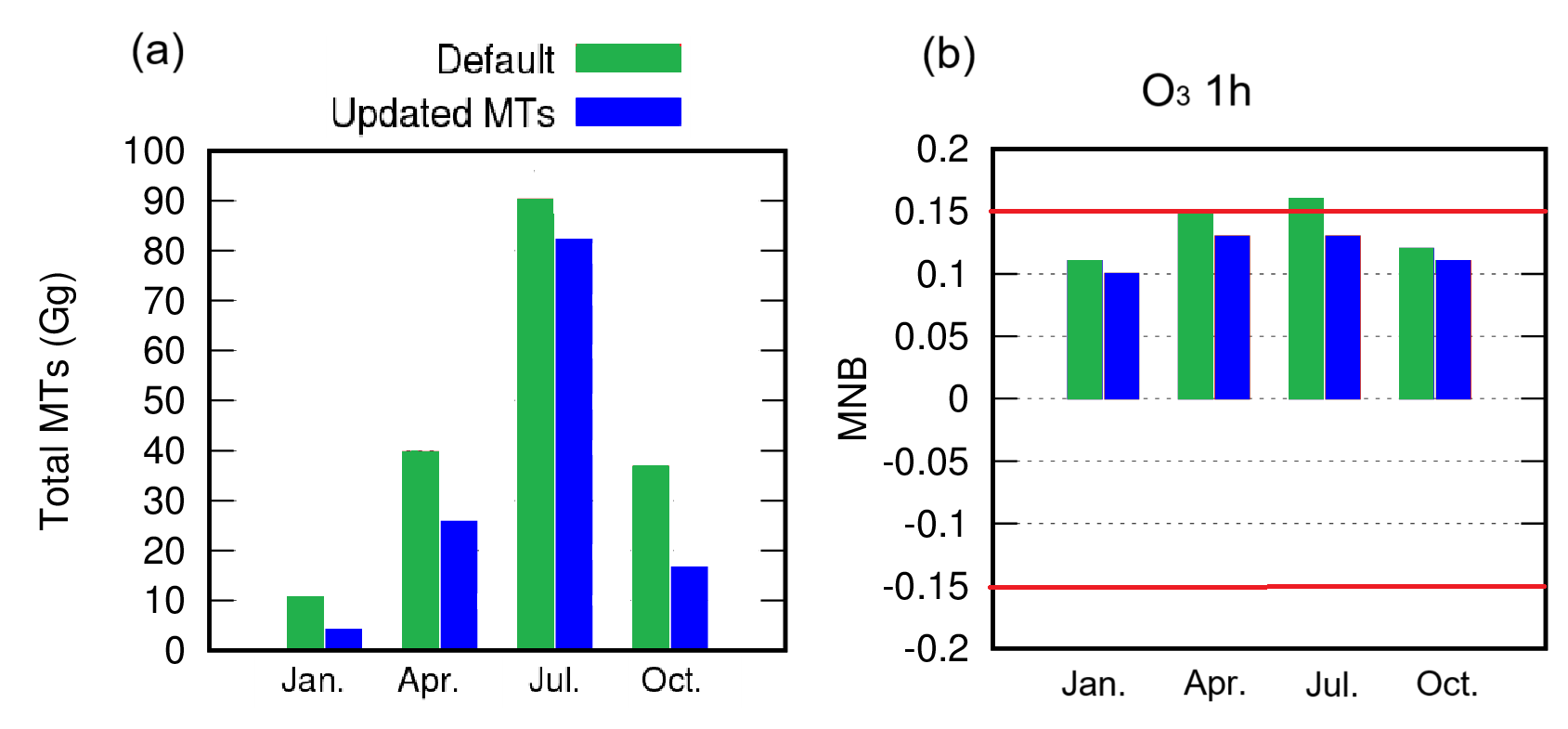 1  算法更新前(Default)后(Updated MTs),(a)广东省四季单萜烯排放量估算对比;(b)臭氧观测值与模拟值逐小时浓度平均标准化偏差(MNB)对比(红线表示U.S. EPA标准值)