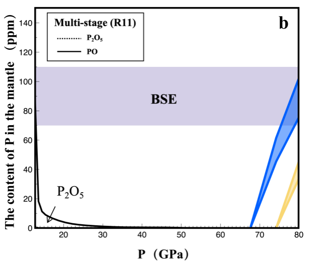 磷是DNA与RNA的必需组分,其地球化学行为对行星分异和生命演化研究具有重要指示意义。作为典型的中等亲铁元素,磷的金属/硅酸盐分配系数对压力(P)和温度(T)极为敏感,是限定早期岩浆洋热力学条件的关键参数。现有研究表明:硅酸盐地球(BSE)的磷丰度出现明显亏损(图1),其亏损机制被认为与核幔分异有关,即在核幔分异过程中,磷在高压下的亲铁性导致大量的磷进入地核。然而,在核幔分异所对应的高压条件下,磷的分配行为至今仍未厘清。并且现有低压(<20 GPa)实验数据显示,磷的拟合结果呈现多种价态。这种价态分歧外推至高压区间,显著放大了分配系数的不确定性。