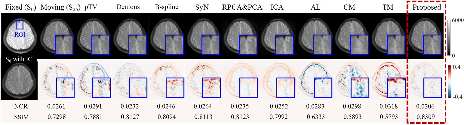 图2:脑部图像在∆ω = –1.2 ppm下的配准结果对比图
