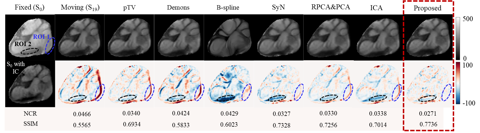CEST-MRI作为一种无创反映组织代谢、微环境及分子交换特性的先进磁共振成像技术,正逐步应用于脑卒中、肿瘤及心肌代谢等领域。与常规 MRI 不同,CEST-MRI 需要在多个频率偏移点连续采集,扫描时间往往从数分钟到十余分钟。呼吸、心跳和体位轻微变化都可能导致帧间错位,而参数图又依赖对整个动态序列的逐像素整合,微小运动即可引入明显偏差,从而影响定量结果和临床诊断。与此同时,不同频率偏移点的饱和效应与组织对比度差异显著,图像在“发生运动”的同时还在“持续变亮变暗”,使得现有配准方法难以有效工作。因此,如何解决运动与强度变化之间的强耦合,已成为 CEST-MRI 实现精准定量的关键技术挑战。