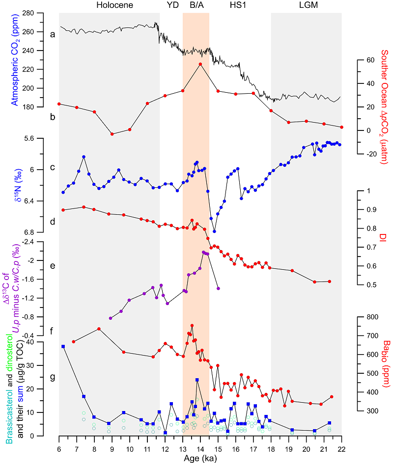 自2018年起,研究团队依托南海海洋研究所在南海南部采集的丰富沉积岩芯样品,重点围绕末次冰期以来热带太平洋海域的中深层环流体系的演变机制开展系列研究(Li et al.,2018;Zhang et al.,2025),旨在揭示太平洋中深层环流演化对热带低纬寡营养盐区海洋生产力的调控机制。本次研究聚焦于末次冰消期Bølling-Allerød(B/A)暖期大气CO₂浓度上升停滞这一科学谜题(Zhu et al.,2025):在该时期,南大洋通风作用增强且生物泵效应减弱,导致大气CO₂含量显著上升,然而南极冰芯记录却显示其浓度在此期间保持稳定(图1)。目前,无论是来自海洋表层CO₂分压的记录重建,还是基于陆地碳汇的数值模拟,均未能查明平衡B/A暖期南大洋显著碳源的关键机制。