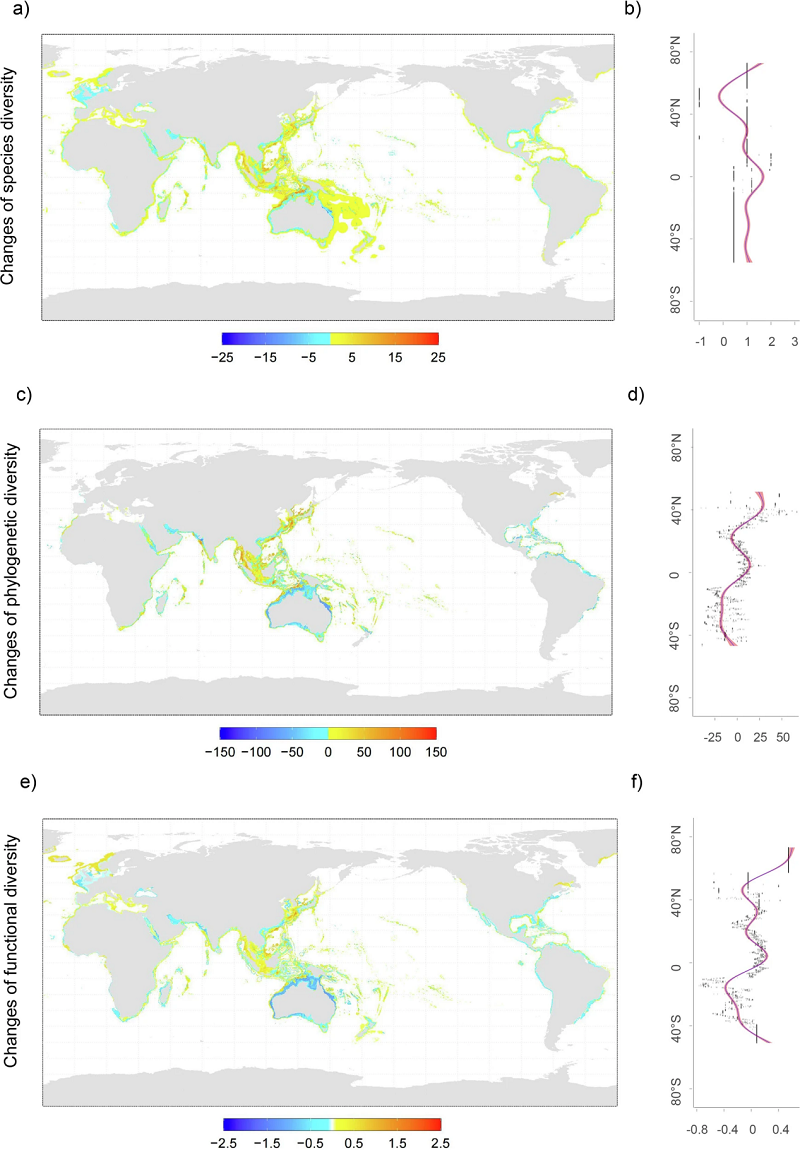 图1 2090-2100年SSP2-4.5情景下羊鱼物种多样性变化、功能多样性变化和系统发育多样性变化格局