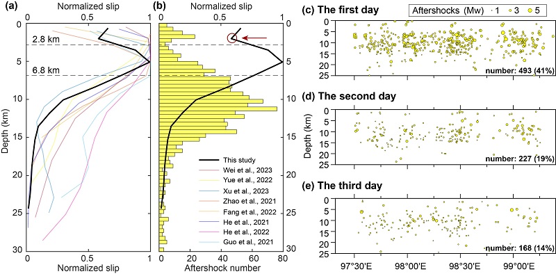 研究揭示了玛多地震破裂的三个关键特征:最大滑移量约9米,集中在断层东段;孕震层宽度仅限于约2-8公里的狭窄深度范围(图1);断层浅部(约2公里以上)存在约40%的浅部滑移亏损(SSD)(图2)。这些特征表明,玛多地震的破裂过程具有显著的深度依赖性和东西段不对称性。
