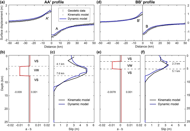 为验证反演结果的可靠性并揭示其内在物理机理,团队开展了基于InSAR数据与地质信息约束的二维地震周期模拟,量化了断层沿走向不同位置处的摩擦属性差异。模拟结果显示,动力学模型与反演模型高度一致;东段孕震层更深(约4.1-7.6公里)、更宽、速率弱化属性更强;而西段孕震层更浅(约2.3-5.1公里)、更窄、速率弱化属性较弱(图3)。这种分段差异导致东段在更大的范围内积累更多应变能并在地震中释放,从而形成东西段不对称的破裂模式。浅部的速率强化层阻碍了破裂向上传播,从而产生了约40%的SSD,剩余能量可能通过震后余滑或长期的震间蠕滑逐渐释放,因此东段存在较高的浅部余滑潜力。