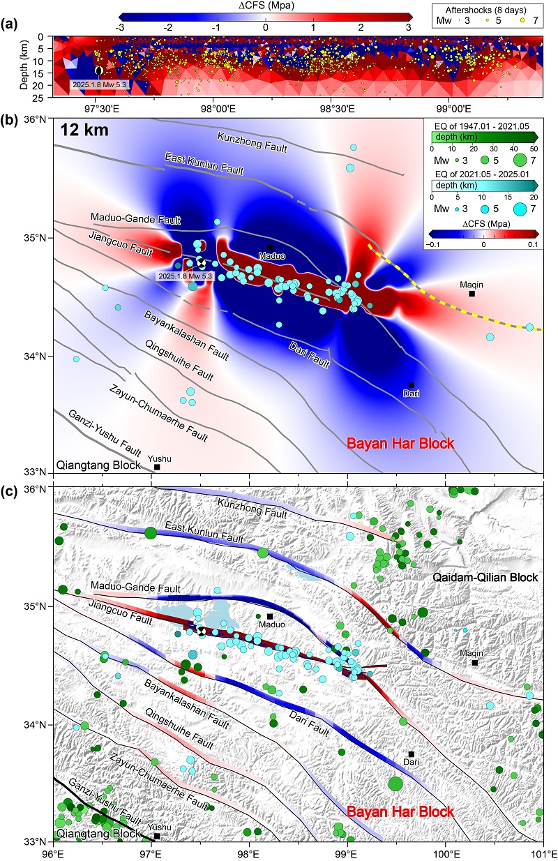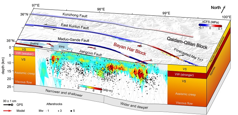 基于优化的滑移模型,团队计算了库仑应力变化,发现应力增加区域能更好地解释震后数日至数年的余震分布,为未来地震危险性评估提供了基础参照模型(图4)。其中,东昆仑断裂的玛沁-玛曲段受应力加载显著,可能是未来潜在的强震危险区。结合东段孕震层更强的速率弱化属性,巴颜喀拉东部地区可能存在更高的地震风险,未来需要增强监测。