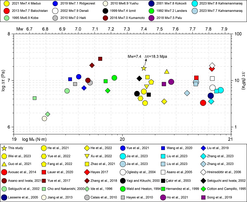 图5 玛多地震及其它全球Mw ≥ 6.9走滑地震的应力降估计