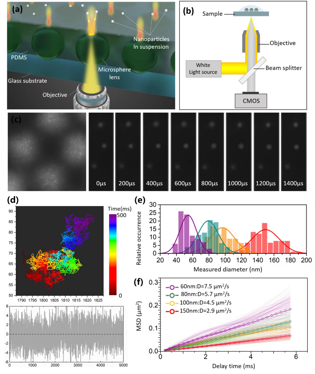 图2. 溶液中运动纳米颗粒实时追踪,实现超高时间分辨率及纳米级定位精度测定;(a).片上光散射增强示意图;(b). 光学系统示意图;(c). 典型单颗粒的图像序列成像;(d). 单个颗粒的运动轨迹;(e). 不同尺寸颗粒的直径测量;(f). 不同尺寸颗粒均方位移曲线分析