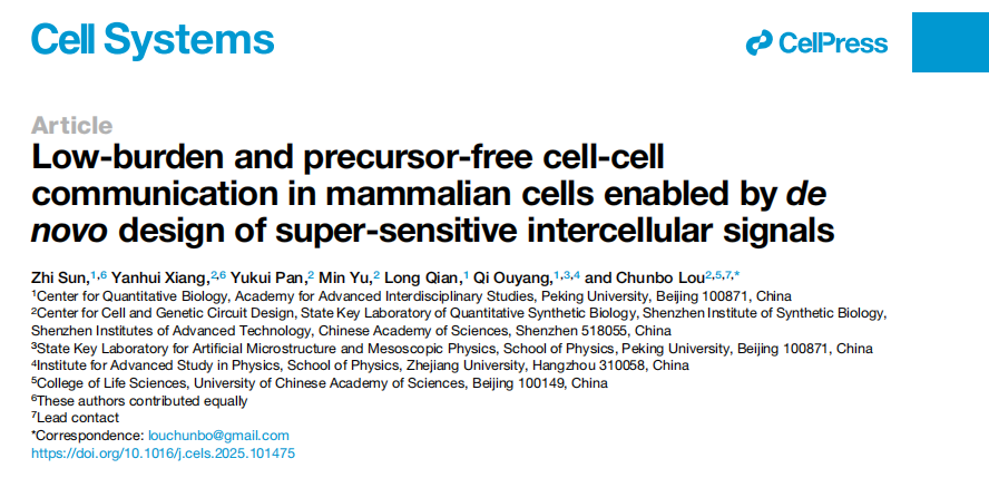 为了解决这些难题,12月17日,中国科学院深圳先进技术研究院娄春波团队联合北京大学合作者,在国际学术期刊Cell Systems上以封面文章形式在线发表题为"Low-burden and precursor-free cell-cell communication in mammalian cells enabled by de novo design of super-sensitive intercellular signals"的研究论文,报道了首个具有超灵敏响应(super-sensitivity)、底盘友好型(low-burden)等优异特性的哺乳动物细胞间通讯的小分子信号系统,并进一步验证了该系统用于指导多细胞系统进行更复杂空间组织的底层能力。