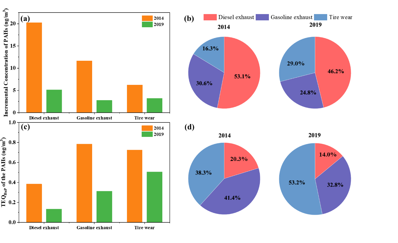研究结果显示,2014-2019年期间,源于柴油车和汽油车尾气排放的PAHs占比从83.7%下降到71.0%,而轮胎磨损对PAHs的贡献则从16.3%上升到29.0%(图2);但如果以TEQBaP来评估潜在致癌风险计,源于尾气排放PAHs对TEQBaP贡献从61.7%下降到46.8%,而轮胎磨损排放PAHs对TEQBaP的贡献则从38.3%上升到53.2%,超过尾气源贡献。这一结果表明,随着尾气控制加严,轮胎磨损等非尾气来源不仅对颗粒物质量浓度有重要贡献,对颗粒物中毒害性组分及其健康危害也可能日益突出。电动汽车因车身更重、扭矩更大可能导致相对较多的轮胎磨损排放,在新能源车不断普及的背景下,更要考虑将非尾气排放纳入监管与健康风险评估,同时通过轮胎制作技术改进减少排放。