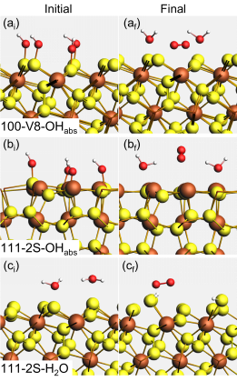 图 1. 黄铁矿{100}-V8和{111}-2S表面将OHads和水氧化成氧气的反应初始及终态构型。黄色、棕色、红色和白色球分别代表S、Fe、O和H