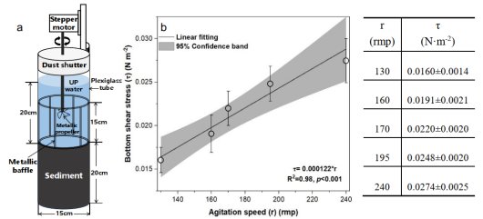 本研究的再悬浮模拟试验依托于改进的EROMES侵蚀系统:由内径15 cm的侵蚀管、扰流板和搅拌器组成。在距沉积物-水界面上7.5 cm处设旋转螺旋桨,利用内设扰流板减小旋流,使沉积物受到均匀的切应力而再悬浮。根据浊度突变点得到石英砂再悬浮的阈值转速,结合经验公式计算其临界切应力,校正水底切应力对转速的响应关系。本研究使用EROMES系统,定量解析了沉积物微塑料再悬浮的临界切应力,是该装置在微塑料动力学研究的首次尝试。